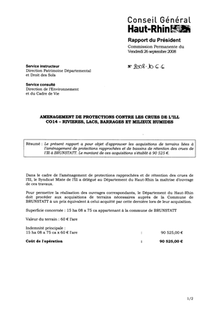 Le présent rapport a pour objet d'approuver les acquisitions de terrains liées à l’aménagement de protections rapprochées et de bassins de rétention des crues de l’Ill à BRUNSTATT. Le montant de ces acquisitions s'établit à 90 525 €.