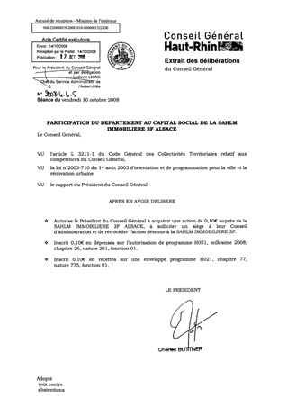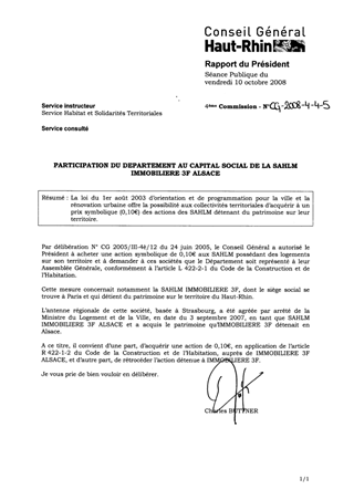 PARTICIPATION DU DEPARTEMENT AU CAPITAL SOCIAL DE LA SAHLM IMMOBILIERE 3F ALSACE