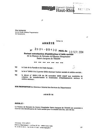 portant autorisation d'habilitation à l'aide sociale de la maison de retraite du centre hospitalier Saint Jacques de Thann. Resumé Pièces jointes ARRETE Assemblée : Non défini Date : 10/09/2004 Rapporteur : Non défini Collectivité : Conseil départemental du Haut-Rhin Direction : Non défini Service : Service études, schémas et programmation des équipements Domaine : Autres (non classés) Commission :