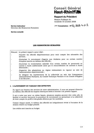 Le présent rapport a pour objet : - d’ajuster les effectifs départementaux pour tenir compte des nécessités des services ; - d’autoriser le recrutement d’agents non titulaires pour un certain nombre d’emplois inscrits au tableau des effectifs ; - d’autoriser la revalorisation salariale d’un certain nombre de personnels en contrat à durée indéterminée ainsi que le renouvellement de contrats à durée déterminée ; - d’apporter des adaptations au régime indemnitaire en vigueur au sein de l’administration départementale ; - de désigner les représentants de la collectivité au sein des Commissions administratives Paritaires, du Comité Technique Paritaire et du Comité d’Hygiène et de Sécurité ;