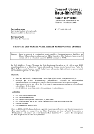 Dans le cadre de la coopération transfrontalière, il vous est proposé d’adhérer au Club d’Affaires Franco-Allemand du Rhin Supérieur-Oberrhein et d’approuver le versement de la cotisation annuelle 2008 à hauteur de 300 €.