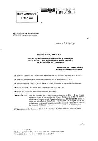 portant réglementation permanente de la circulation sur la RD 10 I, hors agglomération, sur le territoire de la commune de Turckheim. Resumé Pièces jointes ARRETE Assemblée : Non défini Date : 14/09/2004 Rapporteur : Non défini Collectivité : Conseil départemental du Haut-Rhin Direction : Non défini Service : Direction des Routes Domaine : Circulation Commission :