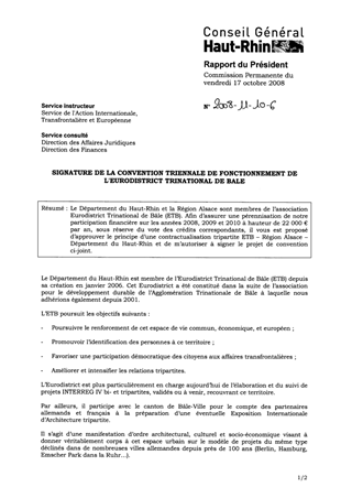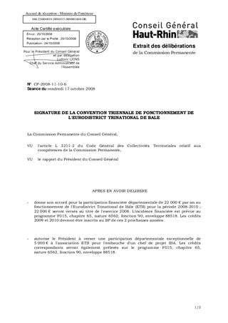 Le Département du Haut-Rhin et la Région Alsace sont membres de l’association Eurodistrict Trinational de Bâle (ETB). Afin d’assurer une pérennisation de notre participation financière sur les années 2008, 2009 et 2010 à hauteur de 22 000 € par an, sous réserve du vote des crédits correspondants, il vous est proposé d’approuver le principe d’une contractualisation tripartite ETB – Région Alsace – Département du Haut-Rhin et de m’autoriser à signer le projet de convention ci-joint.