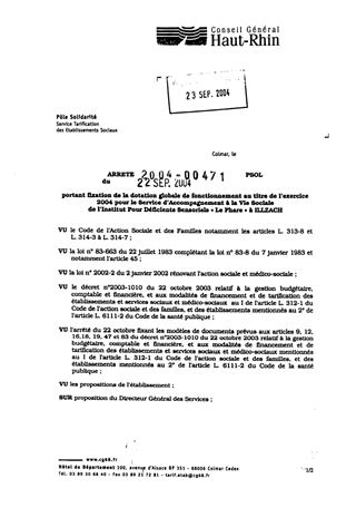 portant fixation de la dotation globale de fonctionnement au titre de l'exercice 2004 pour le service d'accompagnement à la vie sociale de l'Institut pour Déficients Sensoriels "Le Phare" à ILLZACH. Resumé Pièces jointes ARRETE Assemblée : Non défini Date : 22/09/2004 Rapporteur : Non défini Collectivité : Conseil départemental du Haut-Rhin Direction : Non défini Service : Service de la Tarification des Etablissements Domaine : Dotations financières Commission :