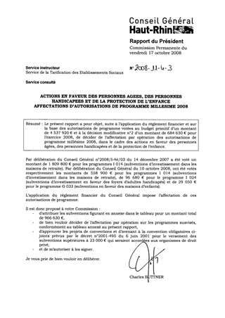 Le présent rapport a pour objet, suite à l’application du règlement financier et sur la base des autorisations de programme votées au budget primitif d’un montant de 4 537 920 € et à la décision modificative n°2 d’un montant de 684 630 € pour l’exercice 2008, de décider de l’affectation par opération des autorisations de programme millésime 2008, dans le cadre des actions en faveur des personnes âgées, des personnes handicapées et de la protection de l’enfance.