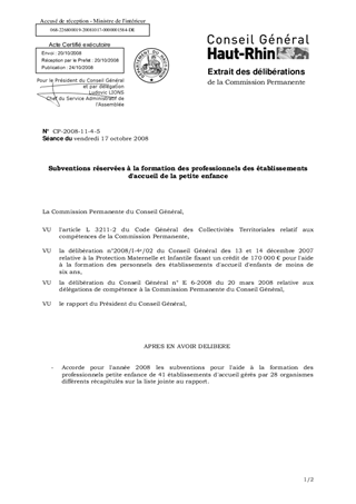 L'Assemblée Départementale, lors de sa session budgétaire pour l'année 2008, a approuvé un crédit de 170 000 € pour l'aide à la formation des personnels des établissements d'accueil d'enfants de moins de six ans du Haut-Rhin. Il est proposé la mise en paiement des subventions concernant l'aide à la formation des professionnels de la petite enfance pour un montant total de 48 983 €, réparti entre les 28 gestionnaires énumérés dans la liste jointe à ce rapport.