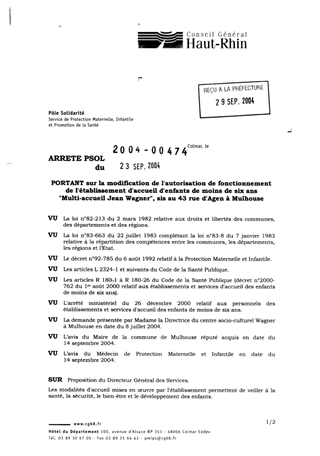 portant sur la modification de l'autorisation de fonctionnement de l'établissement d'accueil d'enfants de moins de six ans "Multi-accueil Jean Wagner", sis au 43 rue d'Agen à MULHOUSE. Resumé Pièces jointes ARRETE Assemblée : Non défini Date : 23/09/2004 Rapporteur : Non défini Collectivité : Conseil départemental du Haut-Rhin Direction : Non défini Service : Service de Protection Maternelle et Infantile Domaine : Accueil d'enfants Commission :