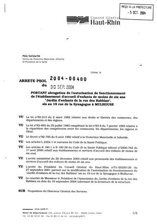 portant abrogation de l'autorisation de fonctionnement de l'établissement d'accueil d'enfants de moins de six ans "Jardin d'enfants de la rue des Rabbins" sis au 19 rue de la Synagogue à MULHOUSE. Resumé Pièces jointes ARRETE Assemblée : Non défini Date : 30/09/2004 Rapporteur : Non défini Collectivité : Conseil départemental du Haut-Rhin Direction : Non défini Service : Service de Protection Maternelle et Infantile Domaine : Accueil d'enfants Commission :