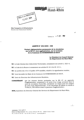 portant réglementation permanente de la circulation sur la RD 47, hors agglomération, sur le territoire de la Commune de RUMERSHEIM LE HAUT. Resumé Pièces jointes ARRETE Assemblée : Non défini Date : 04/10/2004 Rapporteur : Non défini Collectivité : Conseil départemental du Haut-Rhin Direction : Non défini Service : Direction des Routes Domaine : Circulation Commission :