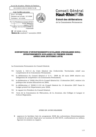 SUBVENTIONS D’INVESTISSEMENTS SCOLAIRES (PROGRAMME E052) : INVESTISSEMENTS SCOLAIRES DU PREMIER DEGRE ANNEE 2008 (HUITIEME LISTE)