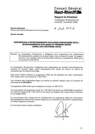 La Commission Permanente a délégation pour programmer les subventions d’investissements scolaires du premier degré, tout au long de l’année. Ce rapport concerne une huitième série de subventions relatives au programme 2008, pour un montant de 363 830 €.