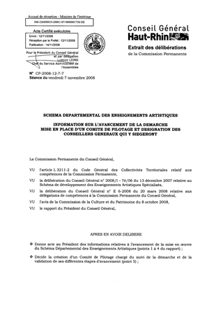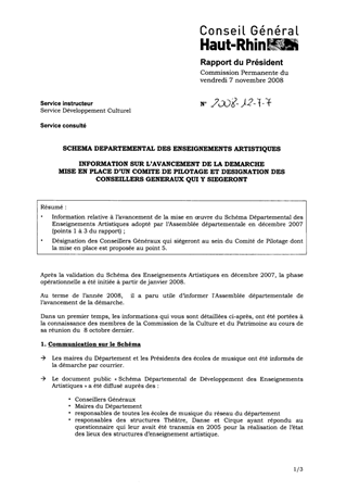 Information relative à l’avancement de la mise en oeuvre du Schéma Départemental des Enseignements Artistiques adopté par l’Assemblée départementale en décembre 2007 (points 1 à 3 du rapport) ; ?? Désignation des Conseillers Généraux qui siégeront au sein du Comité de Pilotage dont la mise en place est proposée au point 5.