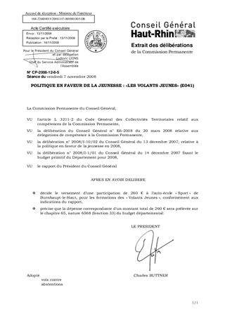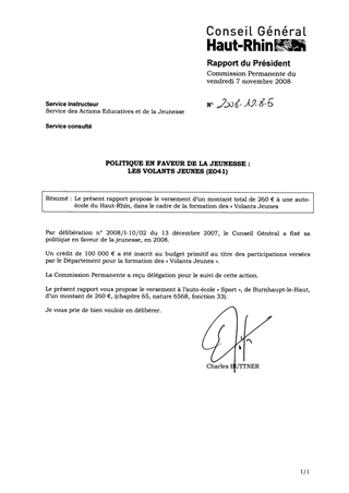 Le présent rapport propose le versement d’un montant total de 260 € à une autoécole du Haut-Rhin, dans le cadre de la formation des « Volants Jeunes