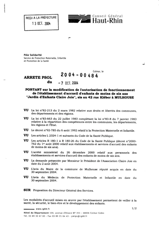 portant sur la modification de l'autorisation de fonctionnement de l'établissement d'accueil d'enfants de moins de six ans "Jardins d'Enfants Claire Joie" sis au 42 rue Kléber à MULHOUSE. Resumé Pièces jointes ARRETE Assemblée : Non défini Date : 07/10/2004 Rapporteur : Non défini Collectivité : Conseil départemental du Haut-Rhin Direction : Non défini Service : Service de Protection Maternelle et Infantile Domaine : Accueil d'enfants Commission :