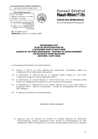 PROGRAMME F027 PLAN DE REVITALISATION DE L’ECONOMIE DANS LE HAUT-RHIN LANGUE ET CULTURE REGIONALES – SOUTIEN AU DEVELOPPEMENT DE NOUVEAUX SITES BILINGUES (SECONDE LISTE 2008)