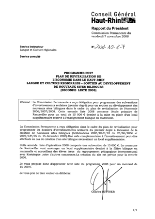 La Commission Permanente a reçu délégation pour programmer des subventions d’investissements scolaires (premier degré) pour un soutien au développement des nouveaux sites bilingues dans le cadre du plan de revitalisation de l’économie 2006/2007/2008. Cette seconde liste 2008 concerne l’école primaire de Rantzwiller pour un total de 15 000 € destiné à la mise en place d’un local supplémentaire réservé à l’enseignement bilingue en maternelle.