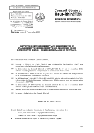 SUBVENTION D'INVESTISSEMENT AUX BIBLIOTHEQUES EN ETABLISSEMENTS D'HEBERGEMENT POUR PERSONNES AGEES DEPENDANTES (EHPAD) : CENTRE HOSPITALIER DE ROUFFACH.