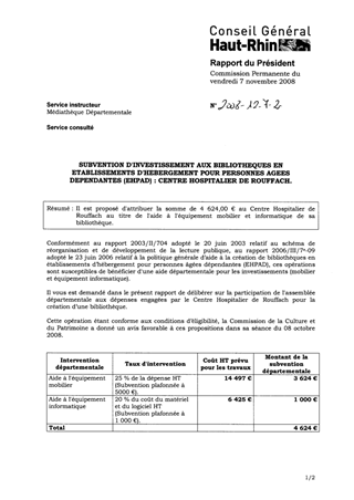 Il est proposé d'attribuer la somme de 4 624,00 € au Centre Hospitalier de Rouffach au titre de l'aide à l'équipement mobilier et informatique de sa bibliothèque.