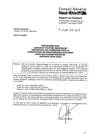 Afin de favoriser l’apprentissage de la lecture en langue allemande, le Conseil Général a mis en place en 1996 une subvention incitative à la constitution de bibliothèques en langue régionale dans les sites bilingues publics. Il est proposé d'attribuer aux communes concernées à la rentrée 2008 des subventions aux taux de 50 % des montants figurant en annexe pour un montant global de 4 150 €.