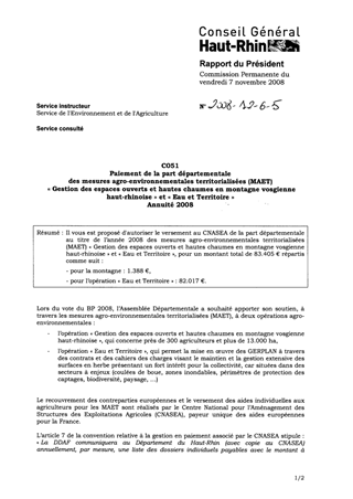 C051 PAIEMENT DE LA PART DEPARTEMENTALE DES MESURES AGRO-ENVIRONNEMENTALES TERRITORIALISEES (MAET) « GESTION DES ESPACES OUVERTS ET HAUTES CHAUMES EN MONTAGNE VOSGIENNE HAUT-RHINOISE » ET « EAU ET TERRITOIRE » ANNUITE 2008