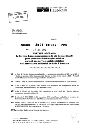 portant habilitation du service d'accompagnement à la vie sociale (SAVS) pour personnes handicapées adultes en tant que service social spécialisé de l'Association Solidarité du Rhin à Biesheim. Resumé Pièces jointes ARRETE Assemblée : Non défini Date : 22/10/2004 Rapporteur : Non défini Collectivité : Conseil départemental du Haut-Rhin Direction : Non défini Service : Service de la Tarification des Etablissements Domaine : Autres (non classés) Commission :