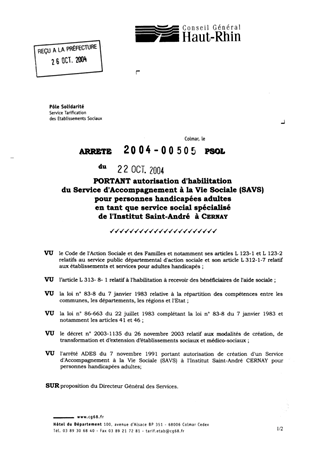 portant autorisation d'habilitation du service d'accompagnement à la vie sociale (SAVS) pour personnes handicapées adultes en tant que service social spécialisé de l'Institut St André à Cernay. Resumé Pièces jointes ARRETE Assemblée : Non défini Date : 22/10/2004 Rapporteur : Non défini Collectivité : Conseil départemental du Haut-Rhin Direction : Non défini Service : Service de la Tarification des Etablissements Domaine : Autres (non classés) Commission :