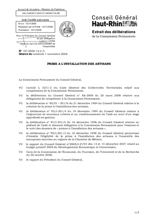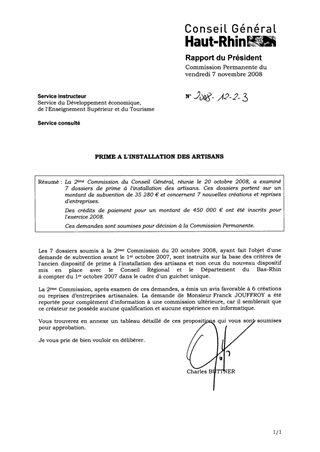 La 2ème Commission du Conseil Général, réunie le 20 octobre 2008, a examiné 7 dossiers de prime à l'installation des artisans. Ces dossiers portent sur un montant de subvention de 35 280 € et concernent 7 nouvelles créations et reprises d'entreprises. Des crédits de paiement pour un montant de 450 000 € ont été inscrits pour l'exercice 2008. Ces demandes sont soumises pour décision à la Commission Permanente.