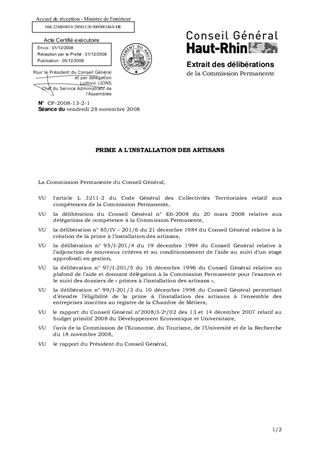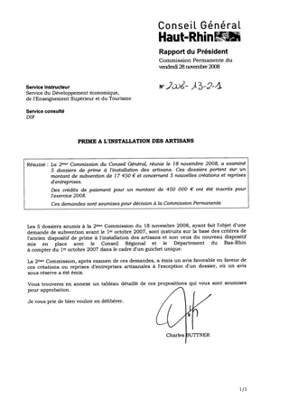 La 2ème Commission du Conseil Général, rénuie le 18 novembre 2008, a éxaminé 5 dossiers de prime à l'installation des artisans. Ces dossiers portent sur un montant de subvention de 17 450 € et concernent 5 nouvelles créations et reprises d'entreprises. Des crédits de paiement pour un montant de 450 000 € ont été inscrits pour l'exercice 2008. Ces demandes sont soumises pour décision à la Commission Permanente.