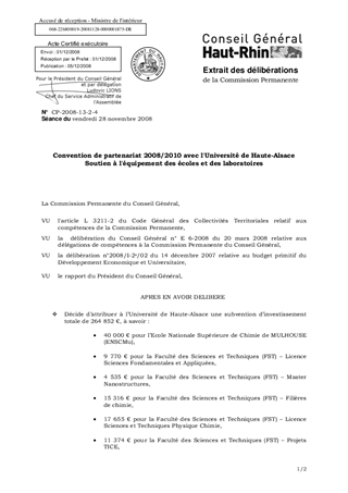 Dans le cadre de la convention de partenariat 2008/2010 du 29 janvier 2008, l'Université de Haute-Alsace sollicite le Conseil Général pour l'attribution d'une subvention d'investissement de 264 852 € destinée à l'équipement de ses écoles et laboratoires.