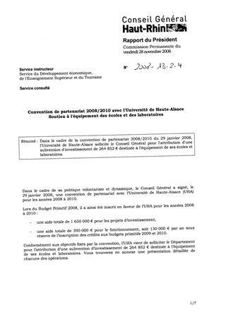 Convention de partenariat 2008/2010 avec l'Université de Haute-Alsace - Soutien à l'équipement des écoles et des laboratoires