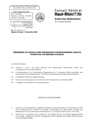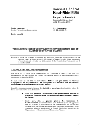 VERSEMENT DU SOLDE D’UNE SUBVENTION D’INVESTISSEMENT 2008 EN FAVEUR DE L’ECOMUSEE D’ALSACE