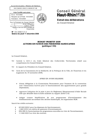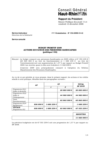 BUDGET PRIMITIF 2009 ACTIONS EN FAVEUR DES PERSONNES HANDICAPEES (politique I 02)