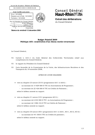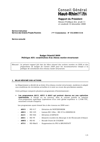 Budget Primitif 2009Politique AO1: constitution d'un réseau routier structurant