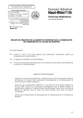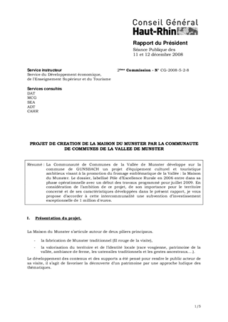 La Communauté de Communes de la Vallée de Munster développe sur la commune de GUNSBACH un projet d’équipement culturel et touristique ambitieux visant à la promotion du fromage emblématique de la Vallée : la Maison du Munster. Le dossier, labellisé Pôle d’Excellence Rurale en 2006 entre dans sa phase opérationnelle avec un début des travaux programmé pour juillet 2009. En considération de l’ambition de ce projet, de son importance pour le territoire concerné et de ses caractéristiques développées dans le présent rapport, je vous propose d’accorder à cette intercommunalité une subvention exceptionnelle d'un million d'euros.