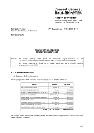 Le budget primitif 2009 pour les transports départementaux est de 29 560 000 euros en fonctionnement et 1 300 000 euros en investissement. Le rapport présente le détail de ce budget ainsi que les principales actions programmées pour 2009.