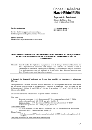 Dans le cadre des réflexions engagées au sein du Groupe de Travail Tourisme, les deux départements alsaciens ont engagé une réforme en matière d'aide à l'hébergement touristique concernant les meublés et les chambres d'hôtes labellisés. Cette collaboration a permis d'aboutir à la définition d'un dispositif commun aux deux départements, objet du présent rapport.