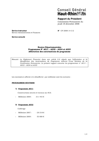 Le Règlement Financier dans son article 6.6 stipule que l’affectation et la désaffection des Autorisations de Programme relèvent d’une décision de la Commission Permanente. Le présent rapport concerne les programmes n° A011 - A032 - A034 et A035