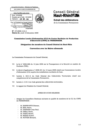 Commission Locale d'Information (CLI) du Centre Nucléaire de Production d'Electricité (CNPE) de FESSENHEIM.Désignation des membres du Conseil Général du Haut-RhinConvention avec les Maires allemands