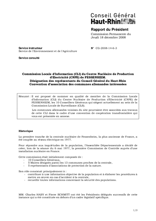 Le présent rapport propose de reconduire les 10 Conseillers Généraux, désignés à l'issue des élections cantonnales partielles de 2008, comme membres de la Commission Locale de Surveillance (CLS) du Centre Nuclaire de Production d'Electricité (CNPE) de FESSENHEIM comme membres de la nouvelle Commission Locale d'Information (CLI) instituée par le décret du 12 mars 2008 auprès de ce même site. Il vous est proposeé d'associer des représentants des communes allemandes aux travaux de la CLI du CNPE de FESSENHEIM dans le cadre d'une convention de coopération transfrontalière qui vous est présentée en annexe.