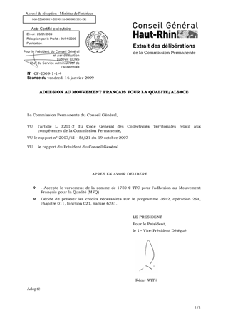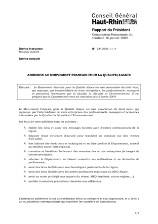 ADHESION AU MOUVEMENT FRANCAIS POUR LA QUALITE/ALSACE Resumé Pièces jointes DELIBERATION RAPPORT Assemblée : Commission Permanente Date : 16/01/2009 Rapporteur : Non défini Collectivité : Conseil départemental du Haut-Rhin Direction : Non défini Service : Mission Démarche Qualité Domaine : Administration Commission : Commission Permanente