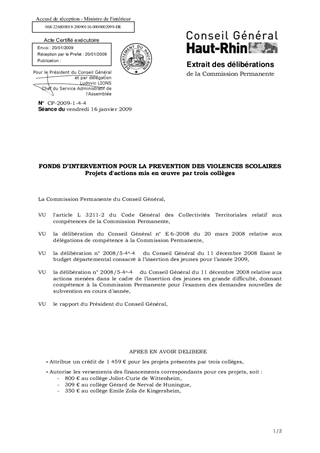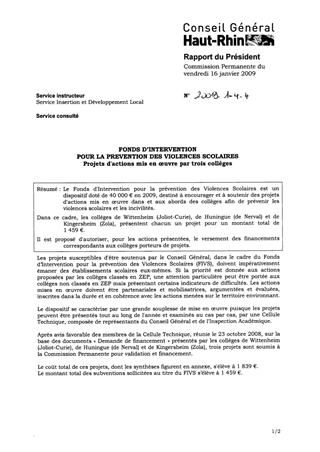 Le Fonds d'Intervention pour la prévention des Violences Scolaires est un dispositif doté de 40 000 € en 2009, destiné à encourager et à soutenir des projets d'actions mis en œuvre dans et aux abords des collèges afin de prévenir les violences scolaires et les incivilités. Dans ce cadre, les collèges de Wittenheim (Joliot-Curie), de Huningue (de Nerval) et de Kingersheim (Zola), présentent chacun un projet pour un montant total de 1 459 €. Il est proposé d'autoriser, pour les actions présentées, le versement des financements correspondants aux collèges porteurs de projets.