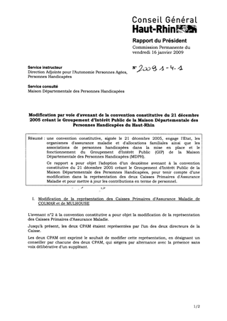 Modification par voie d'avenant de la convention constitutive du 21 décembre 2005 créant le Groupement d'Intérêt Public de la Maison Départementale des Personnes Handicapées du Haut-Rhin