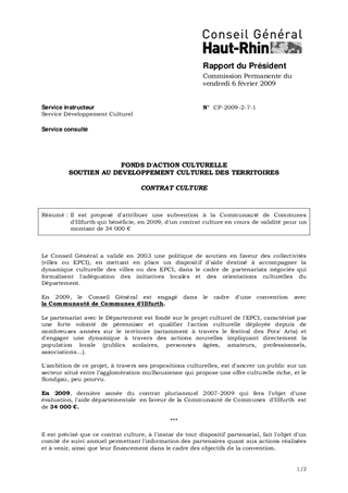 Il est proposé d'attribuer une subvention à la Communauté de Communes d'Illfurth qui bénéficie, en 2009, d'un contrat culture en cours de validité pour un montant de 34 000 €