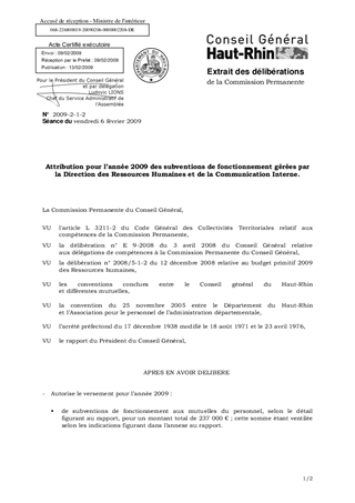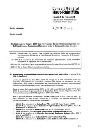 Dans le cadre du rapport, il est proposé d’attribuer en 2009, les subventions de fonctionnement gérées par la Direction des Ressources Humaines, de la manière suivante : - 237 000 € à l’ensemble des mutuelles du personnel départemental (hors assistantes maternelles et agents de la Cité de l’enfance) - 726 000 € à l’association pour le personnel de l’administration départementale (ASPAD 68) - 205 000 € à la Caisse départementale de retraites.