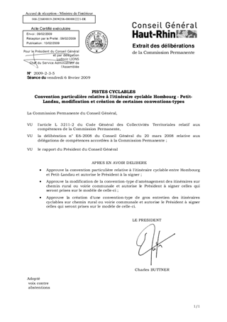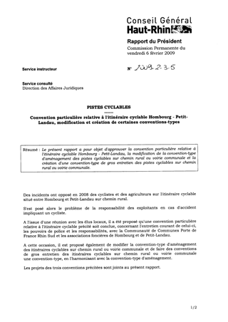 Le présent rapport a pour objet d'approuver la convention particulière relative à l'itinéraire cyclable Hombourg - Petit-Landau, la modification des coventions-types d'aménagement des pistes cyclables sur chemin rural ou voirie communale et la création des conventions-types de gros entretien des pistes cyclables sur chemin rural ou voirie communale.