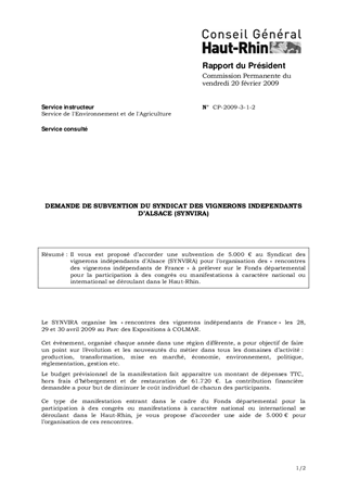 DEMANDE DE SUBVENTION DU SYNDICAT DES VIGNERONS INDEPENDANTS D’ALSACE (SYNVIRA)