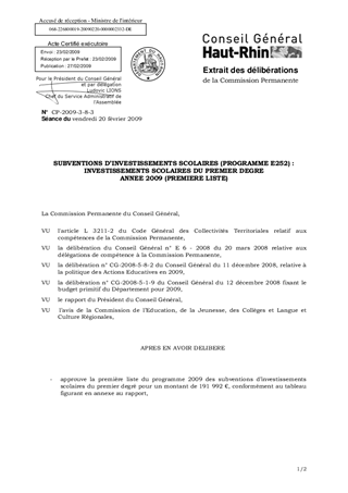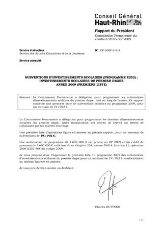 SUBVENTIONS D’INVESTISSEMENTS SCOLAIRES (PROGRAMME E252) : INVESTISSEMENTS SCOLAIRES DU PREMIER DEGRE ANNEE 2009 (PREMIERE LISTE)