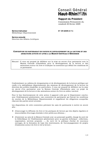 Il vous est proposé de délibérer sur la mise en oeuvre d'un partenariat avec la Maison Centrale d'Ensisheim pour le développement de la lecture et des animations autour du livre et d'adopter la convention qui définit les conditions de ce partenariat