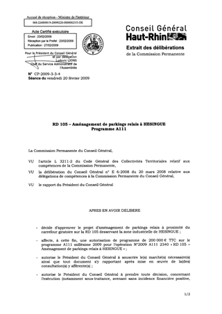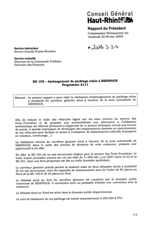 RD105 - AMENAGEMENT DE PARKINGS RELAIS A HESINGUE PROGRAMME A011 Resumé RD 105 - Aménagement de parkings relais à HESINGUE Programme A111 Pièces jointes DELIBERATION RAPPORT Assemblée : Commission Permanente Date : 20/02/2009 Rapporteur : Non défini Collectivité : Conseil départemental du Haut-Rhin Direction : Non défini Service : Service Grands Projets Routiers Domaine : Transports / Routes Commission : Commission Permanente