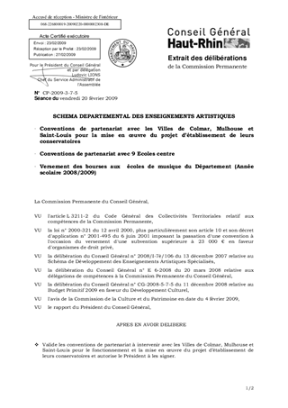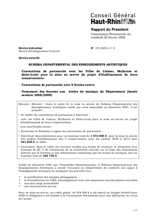 Résumé : Dans le cadre de la mise en œuvre du Schéma Départemental des Enseignements Artistiques validé par votre assemblée en décembre 2007, il est proposé : de valider les conventions de partenariat à intervenir : - avec les Villes de Colmar, Mulhouse et Saint-Louis pour la mise en œuvre du projet d’établissement de leur conservatoire, - avec neuf Ecoles centre ; d’autoriser le Président à signer les conventions de partenariat ; d’attribuer des subventions pour un montant total de 1 472 000 € pour la mise en œuvre des projets d’établissement des 3 conservatoires pour les années 2009 à 2012 dont 361 000 € en 2009 ; d'autoriser, dans le cadre des bourses versées aux écoles de musique, le versement d’un acompte de 80 % de l’estimation de la subvention calculée sur la base des dispositions prévues par le Schéma et des informations transmises par les écoles de musique, soit un montant total de 463 755 €.